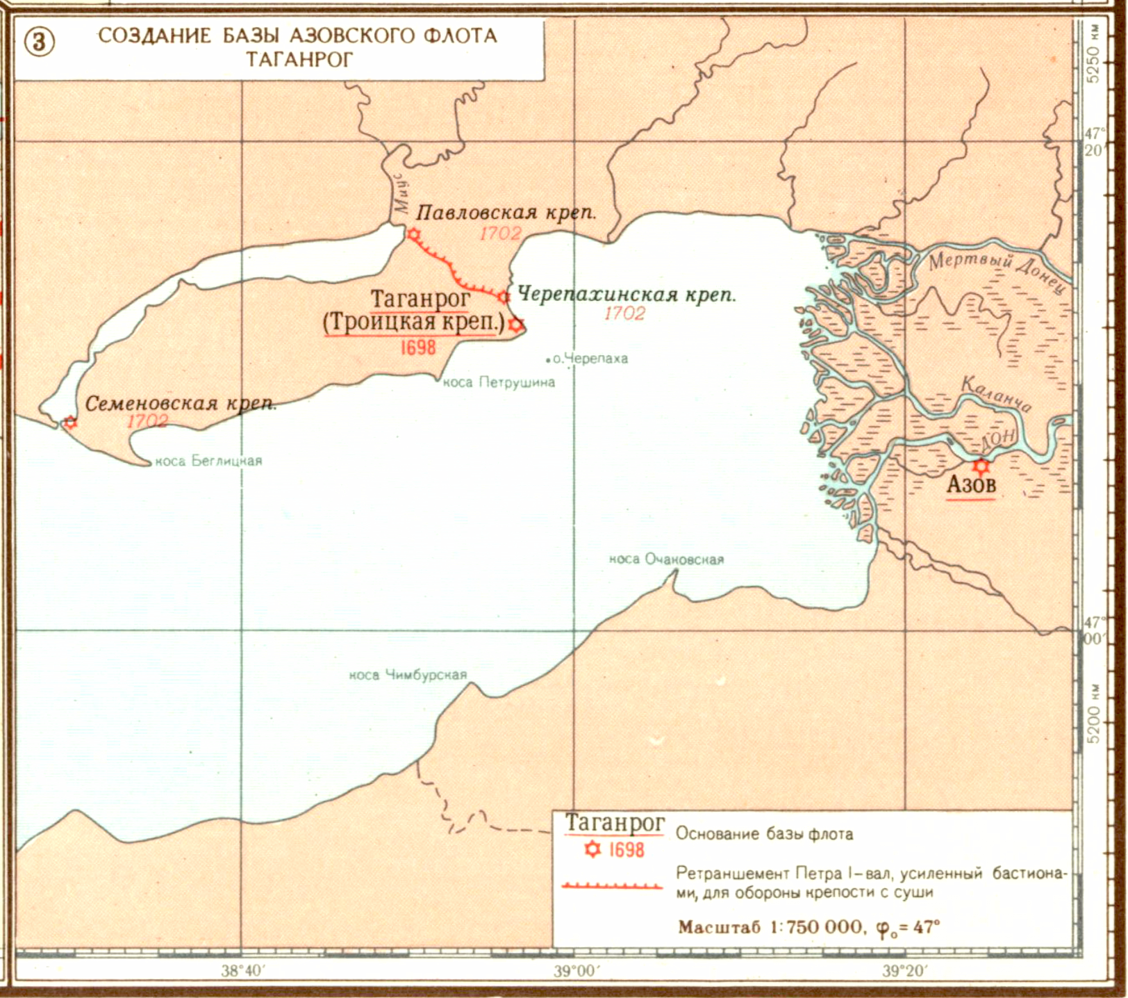 Азовские походы 1695-1696 гг. (З) Создание базы Азовского флота Таганрог.