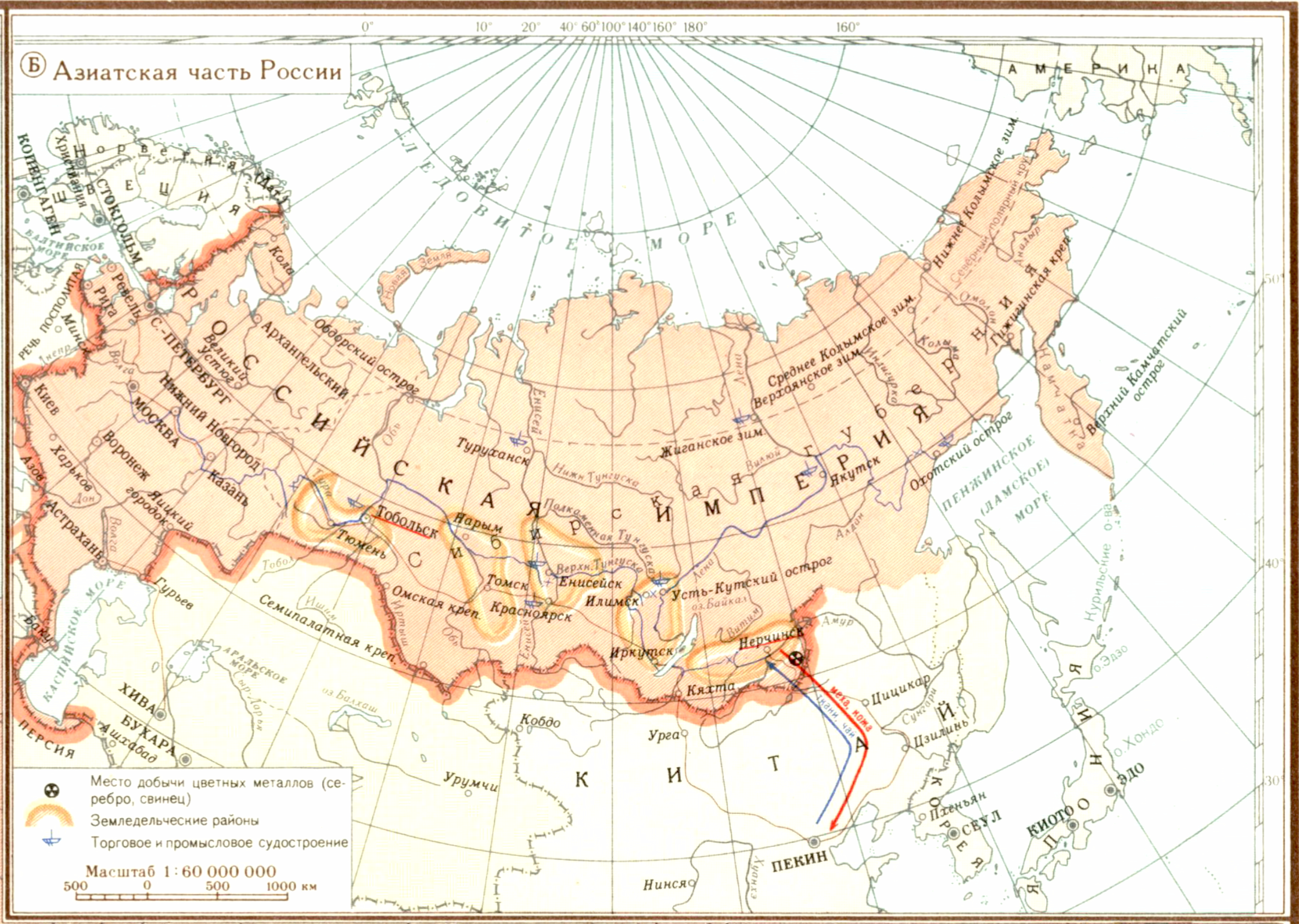 Военно-экономическая карта России к концу первой четверти XVIII в. (Б) Азиатская часть России.