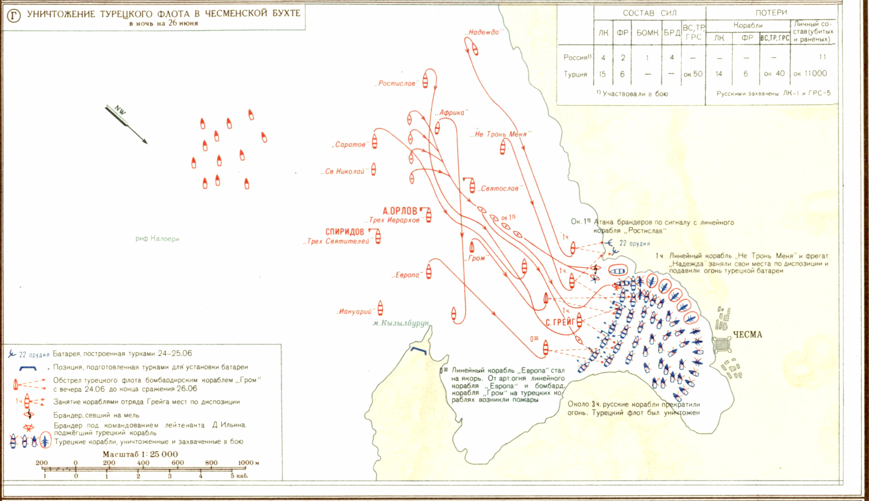 Русско-турецкая война 1768-1774 гг. Чесменское сражение 24-26 июня 1770 г. (Г) Уничтожение турецкого флота в Чесменской бухте в ночь на 26 июня 1770.