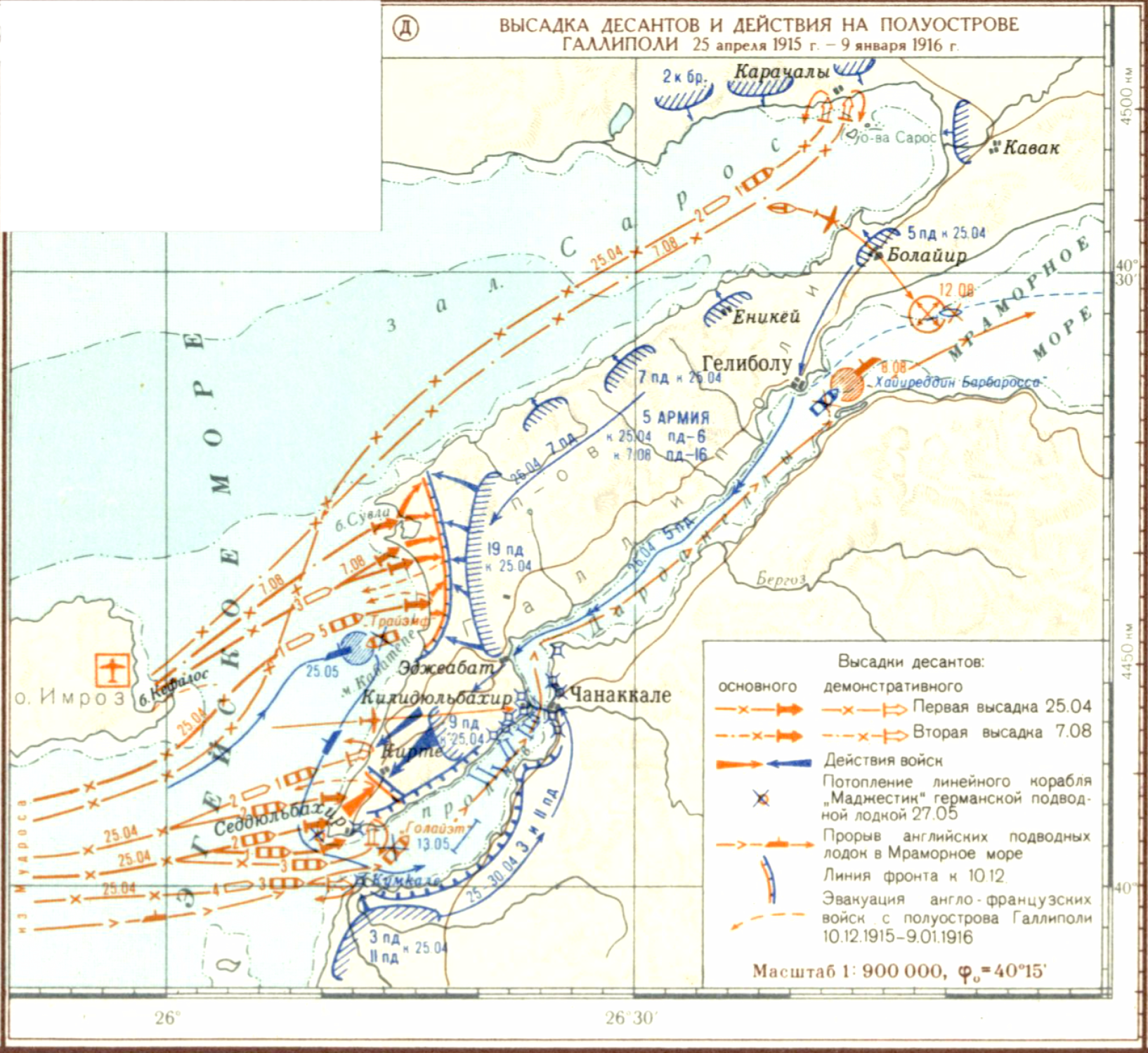 Первая мировая империалистическая война 1914-1918 гг. Кампания 1915 года. (Д) Высадка десантов и действия на полуострове Галлиполи 25 апреля 1915 - 9 января 1916 гг.