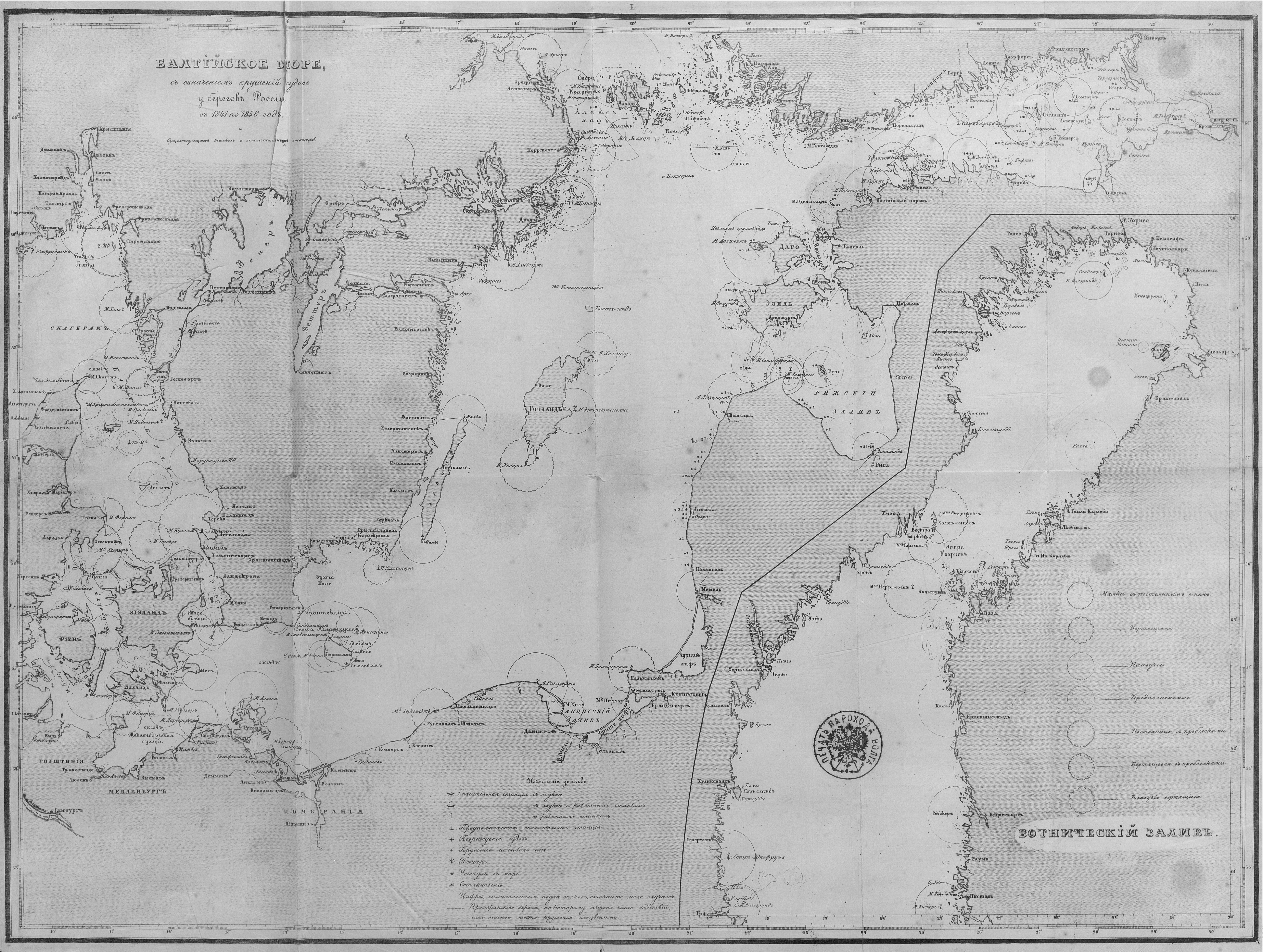 Балтийское море с означением крушений судов у берегов России с 1841 по 1858 год и существующие маяки и спасительные станции