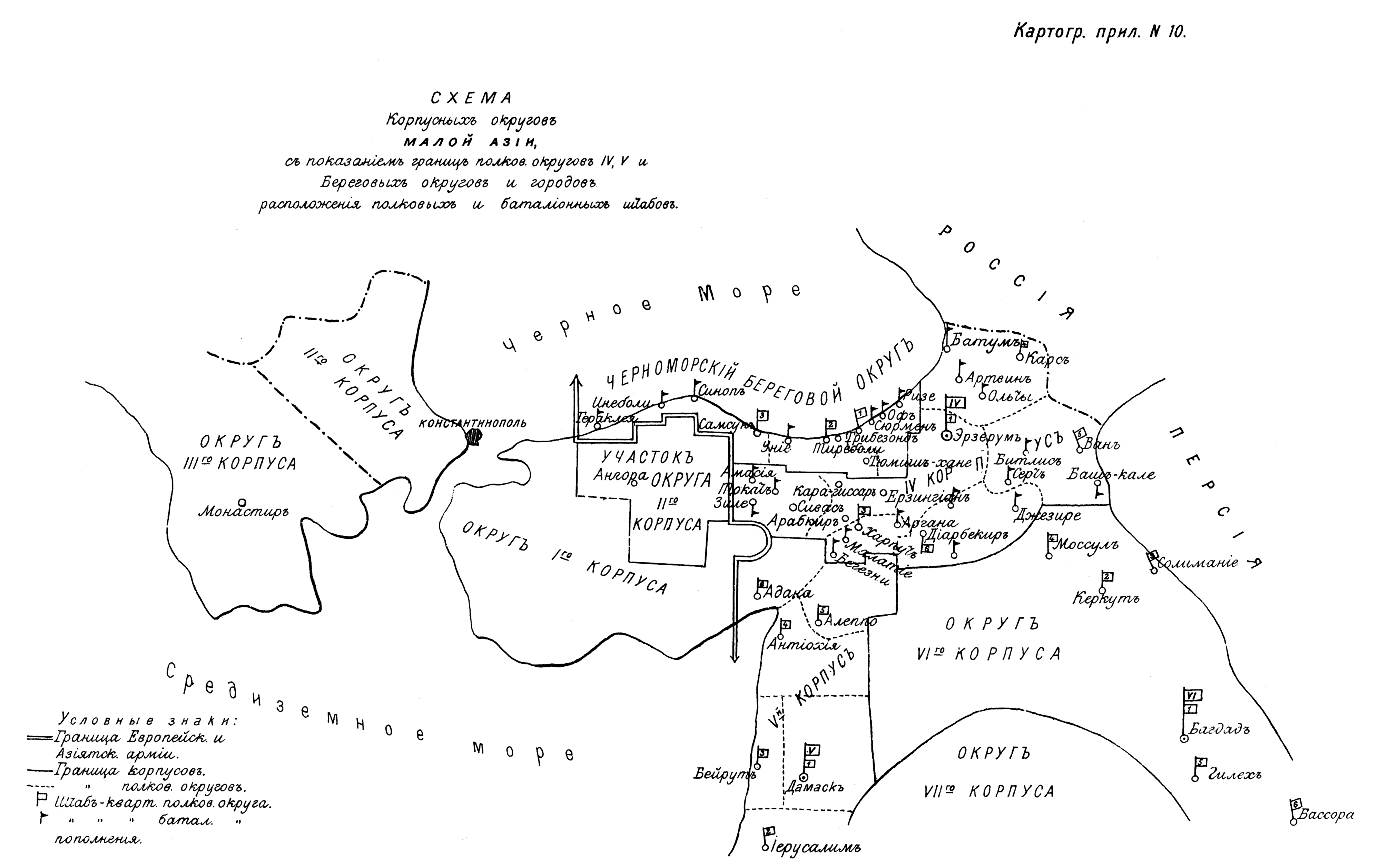 Схема корпусных округов Малой Азии, с показанием границ полковых округов IV, V и Береговых округов и городов расположения полковых и батальонных штабов