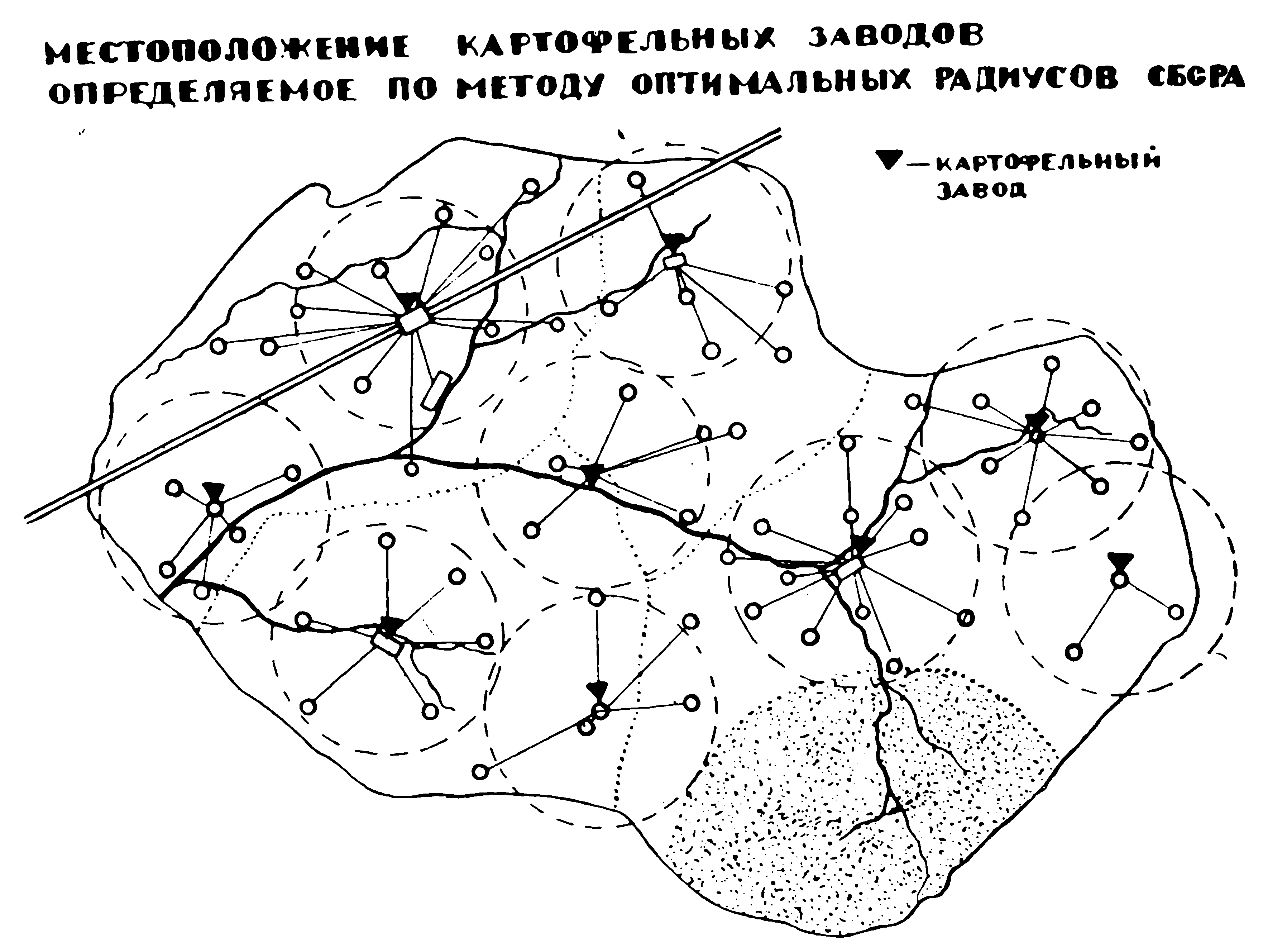 Местоположение картофельных заводов, определяемое по методу оптимальных радиусов сбора