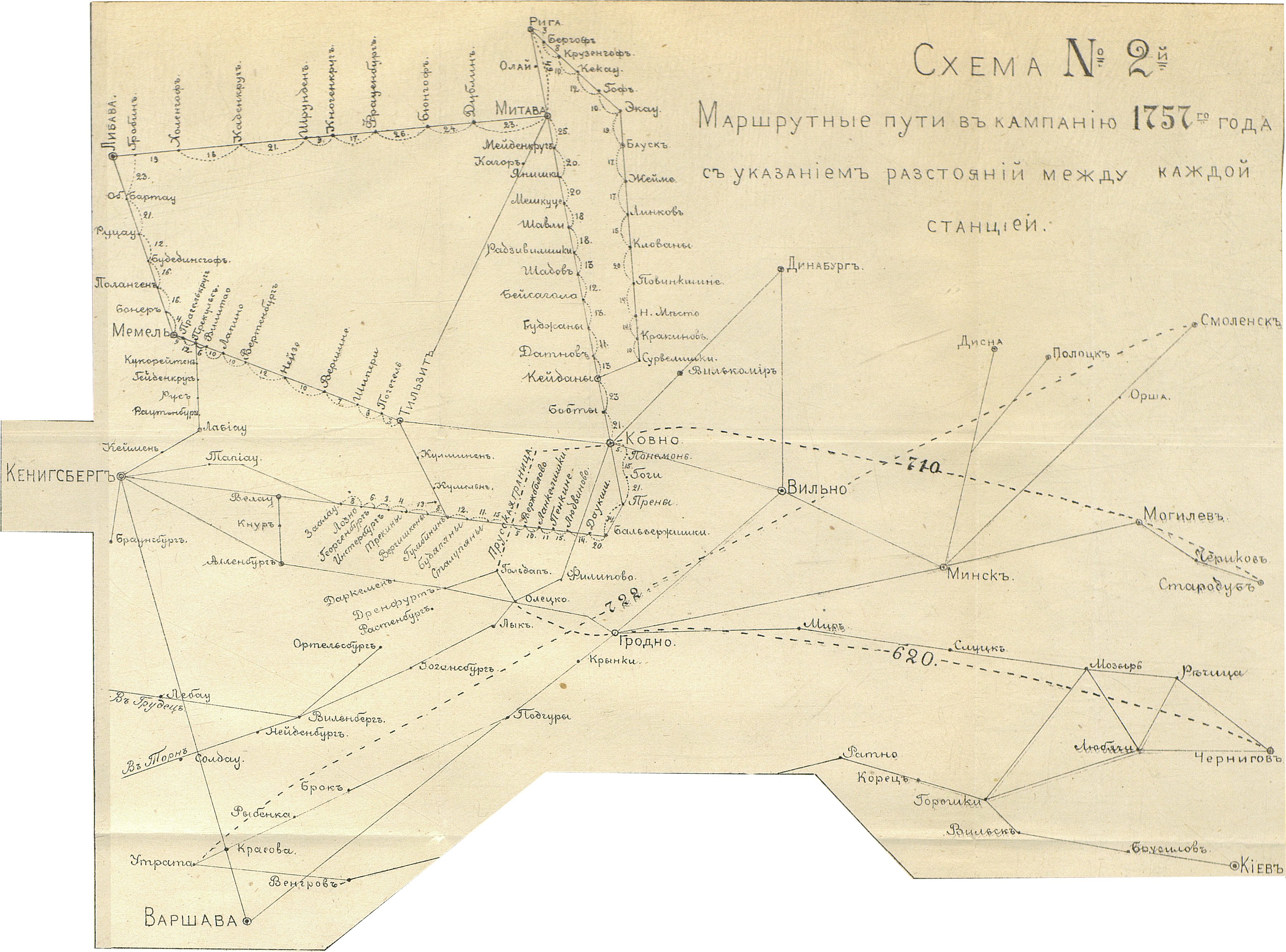 Маршрутные пути в кампанию 1757 года с указанием расстояний между каждой станцией