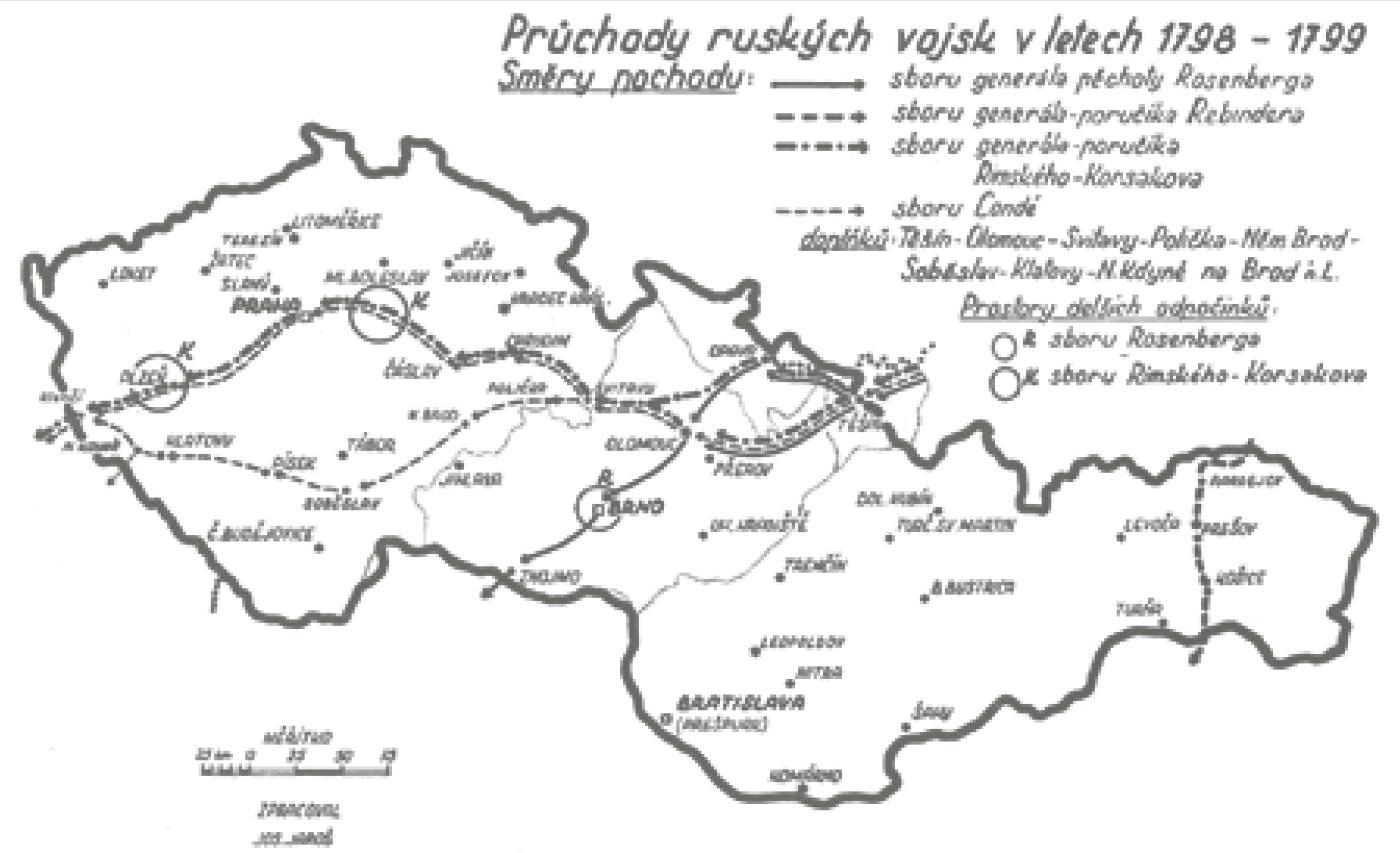 Маршруты движения русских войск (1798-1799), спроецированные на карту Чехословакии