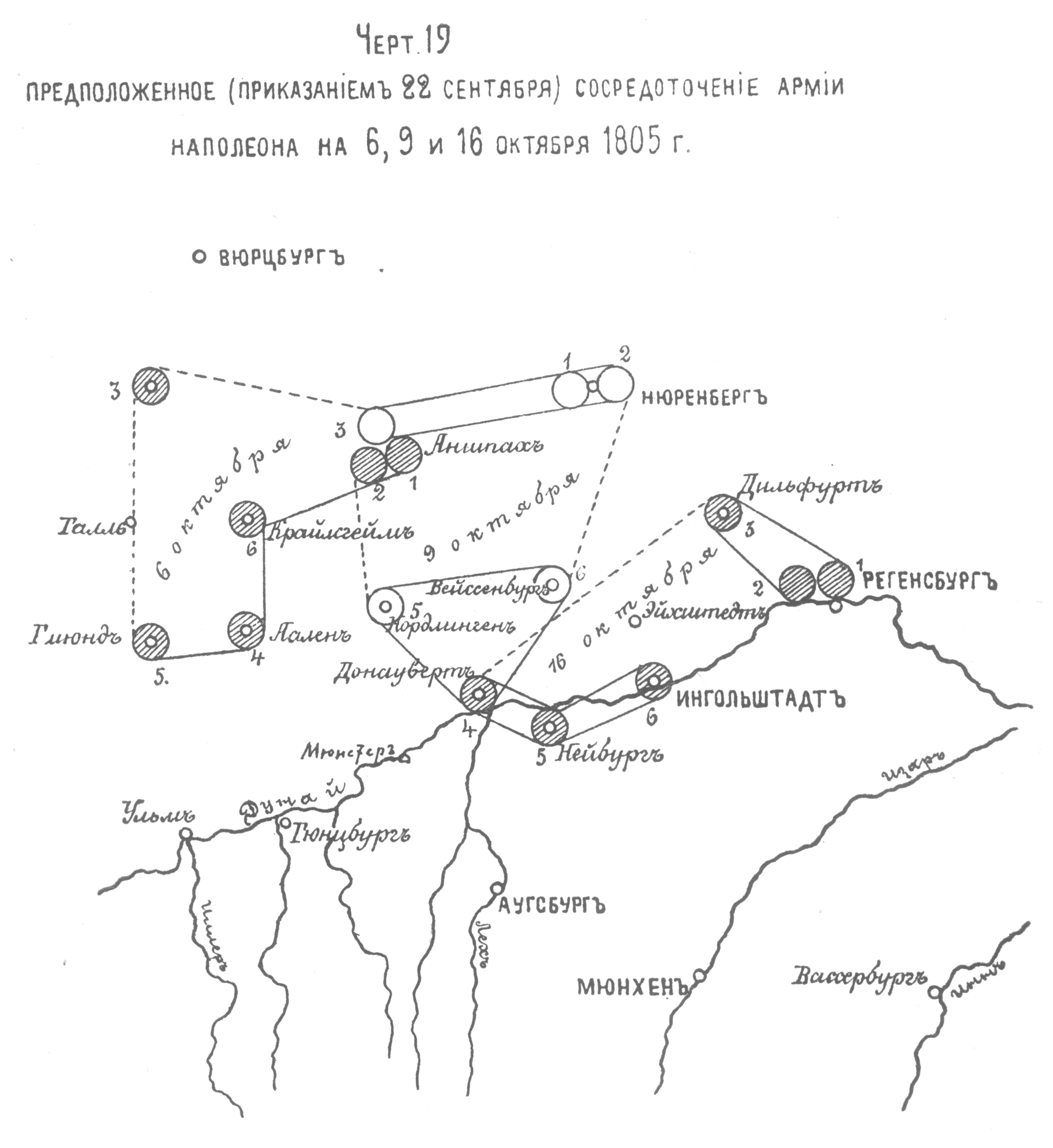 Предположенное (приказанием 22 сентября) сосредоточение армии Наполеона на 6, 9, и 16 октября 1805 года
