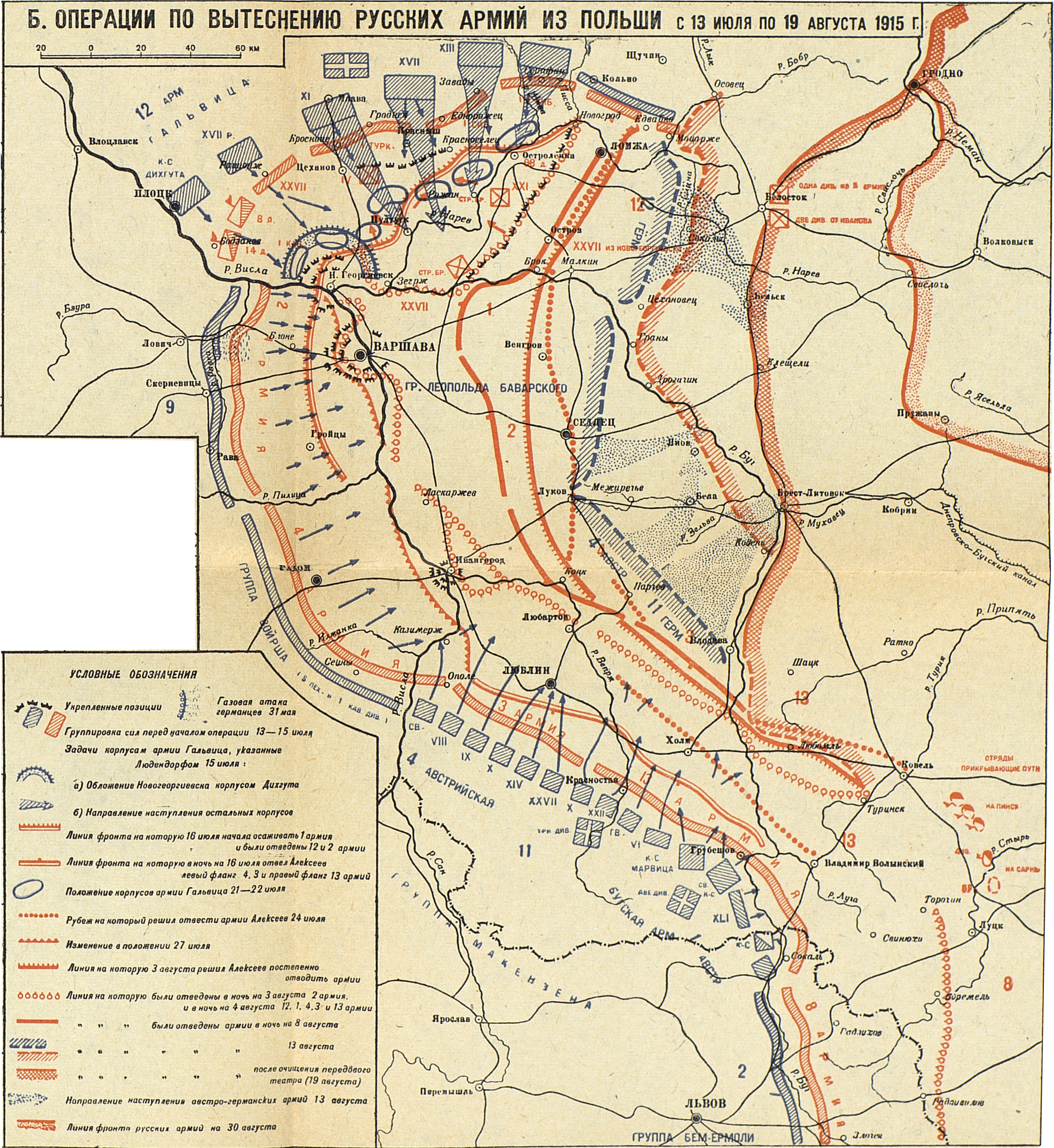 Кампания 1915 года. Русский театр. Отход русских армий. Газобаллонная атака германцев в мае-июле у Воли Шидловской и Боржимова