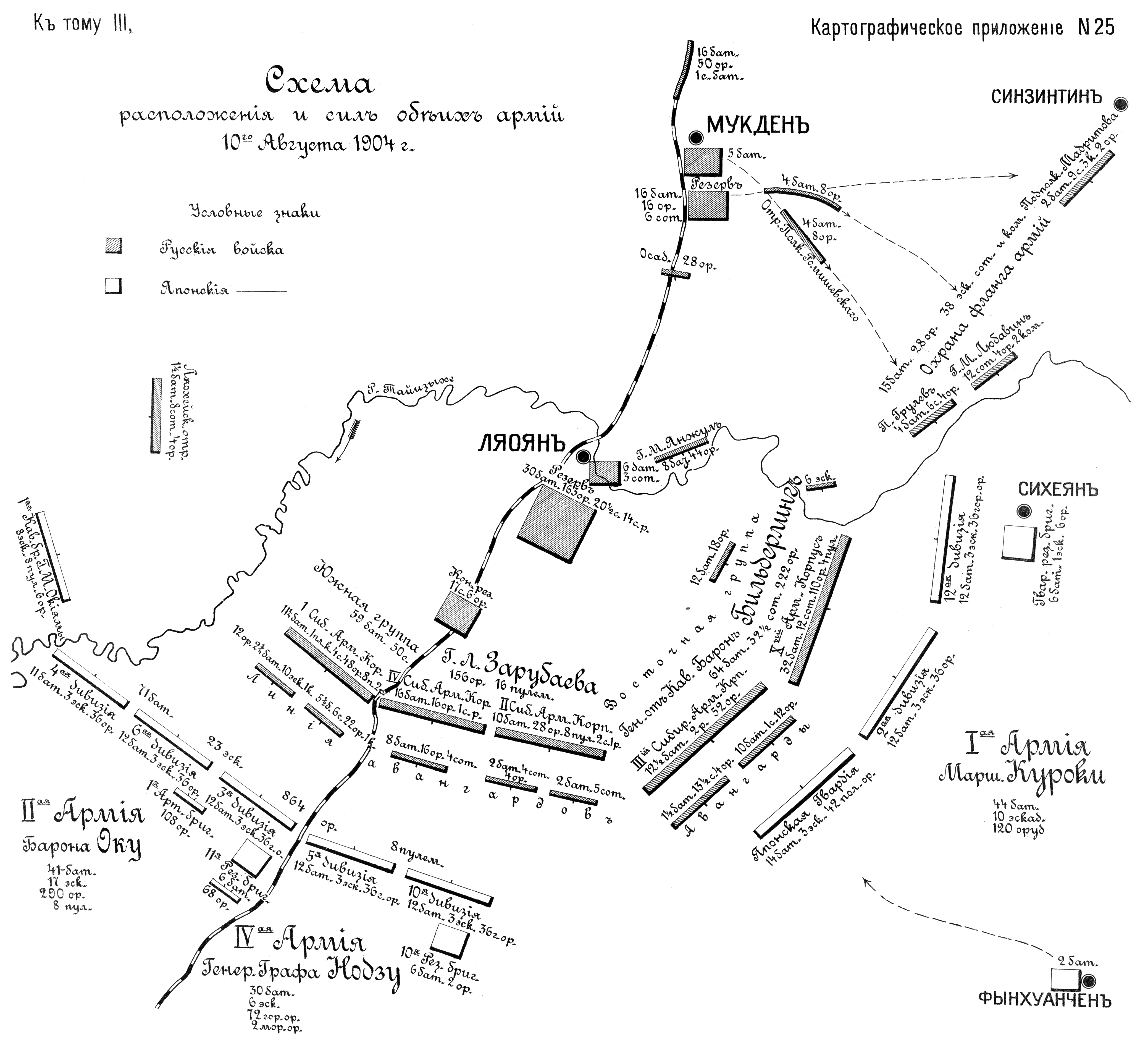 Схема расположения и сил обеих армий 10 августа 1904 года