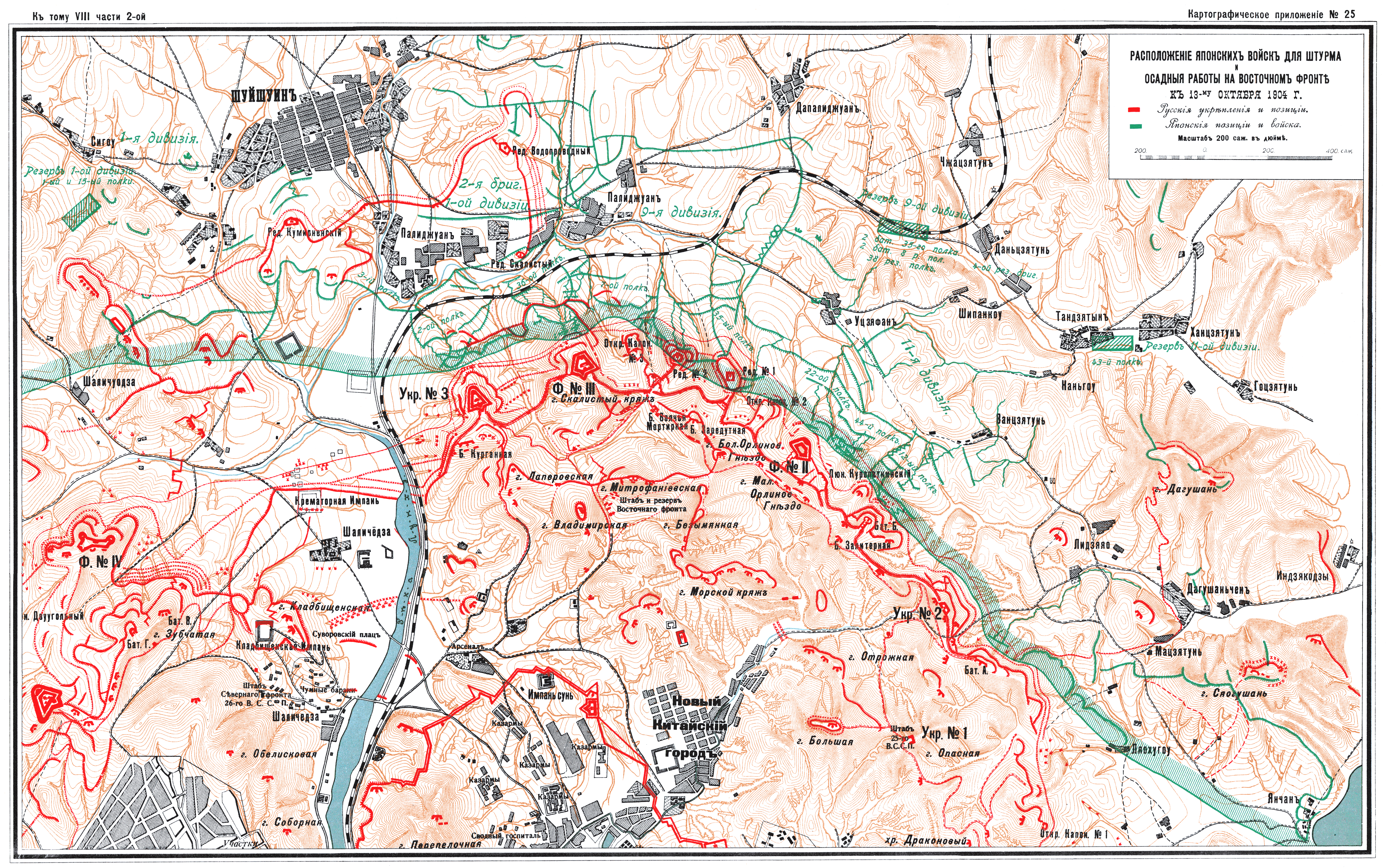 Расположение японских войск для штурма и осадные работы на Восточном фронте к 13-му октября 1904 года