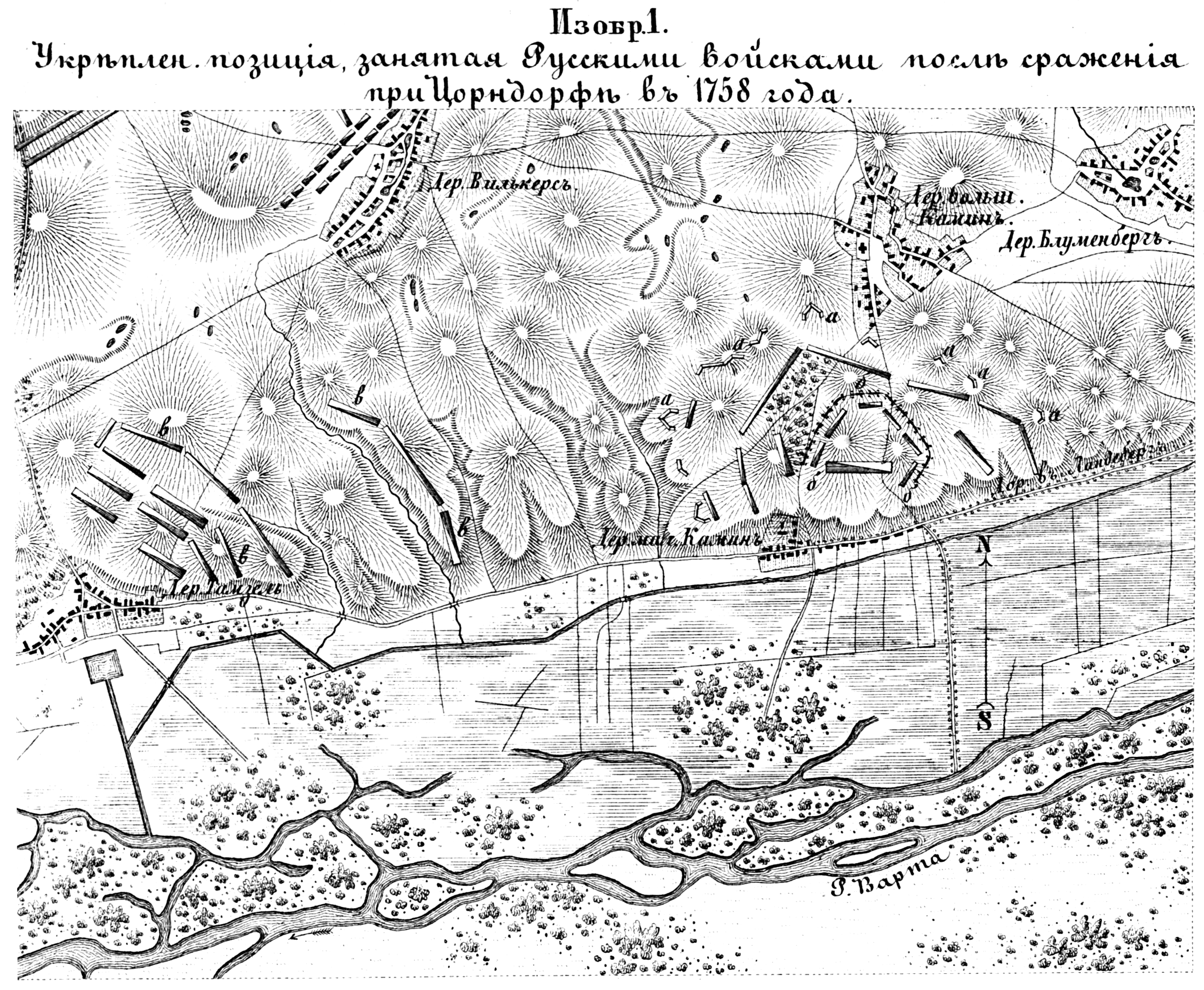 Полевые и временные укрепления. Изобр.1. Укрепленная позиция, занятая русскими войсками после сражения при Цорндорфе в 1758 году