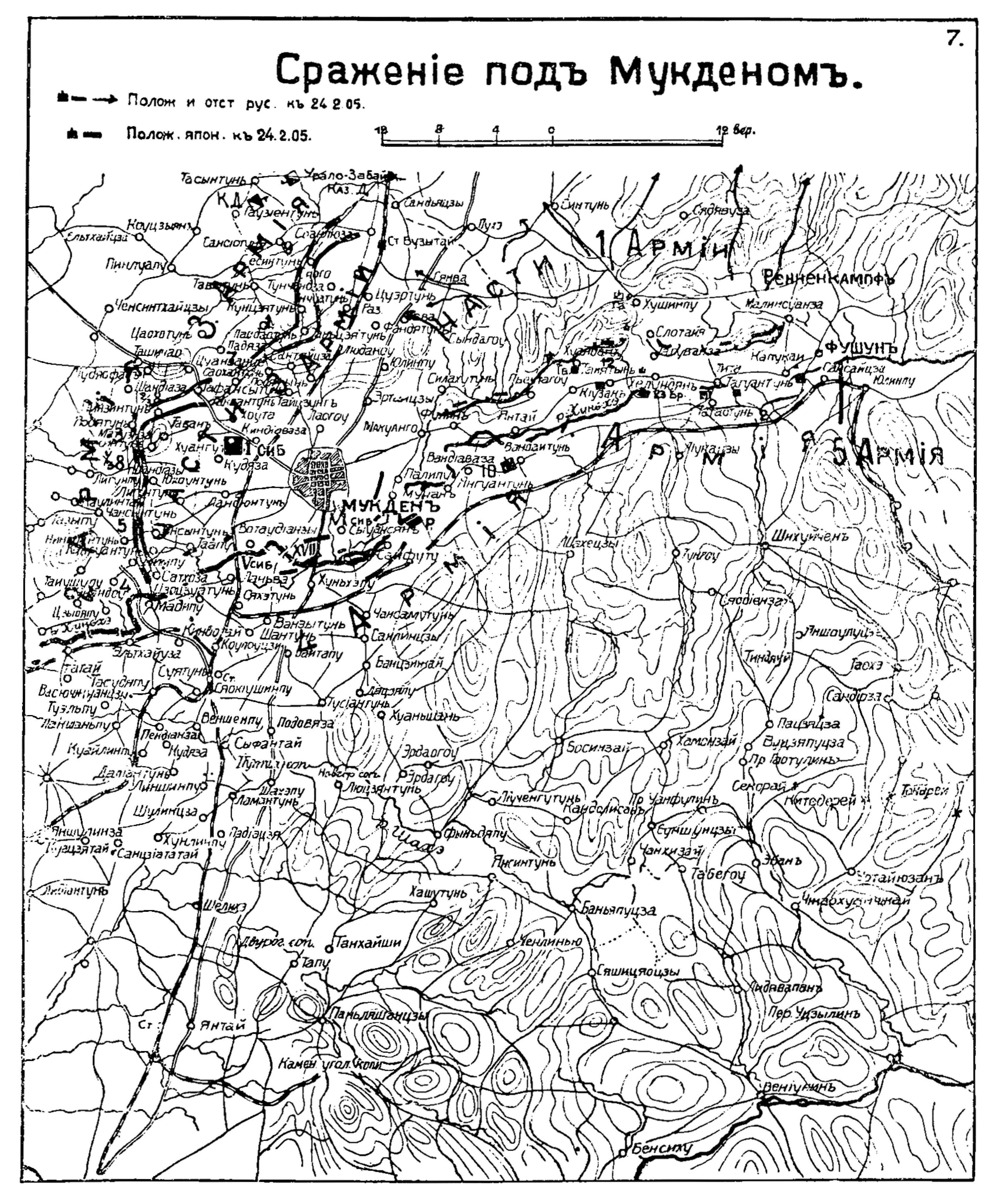 Сражение под Мукденом. Положение 24 февраля 1905 года. Позиции японцев и маршрут отступления русских