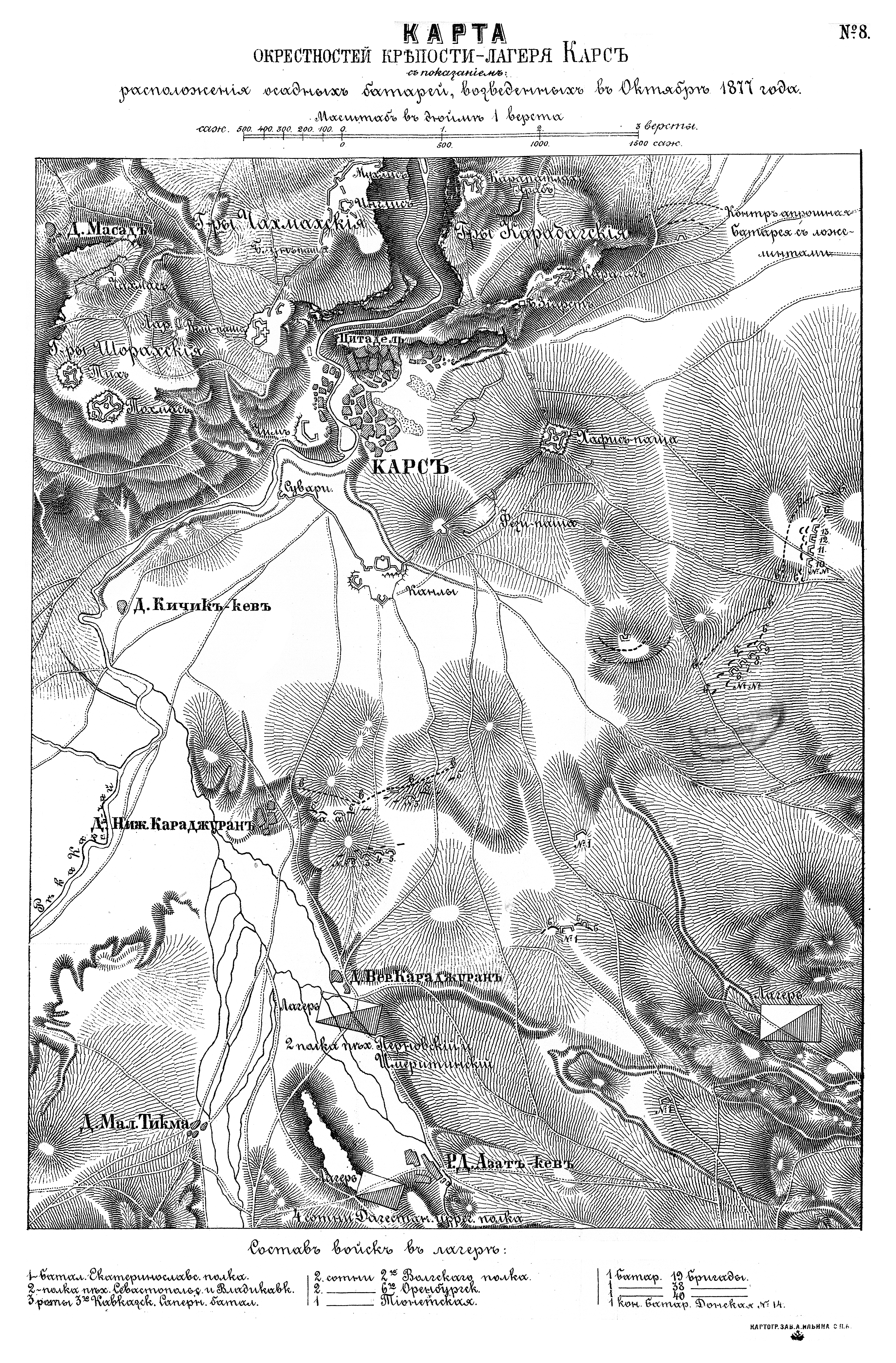 Окрестности крепости-лагеря Карс с показанием расположения осадных батарей, возведенных в октябре 1877 года