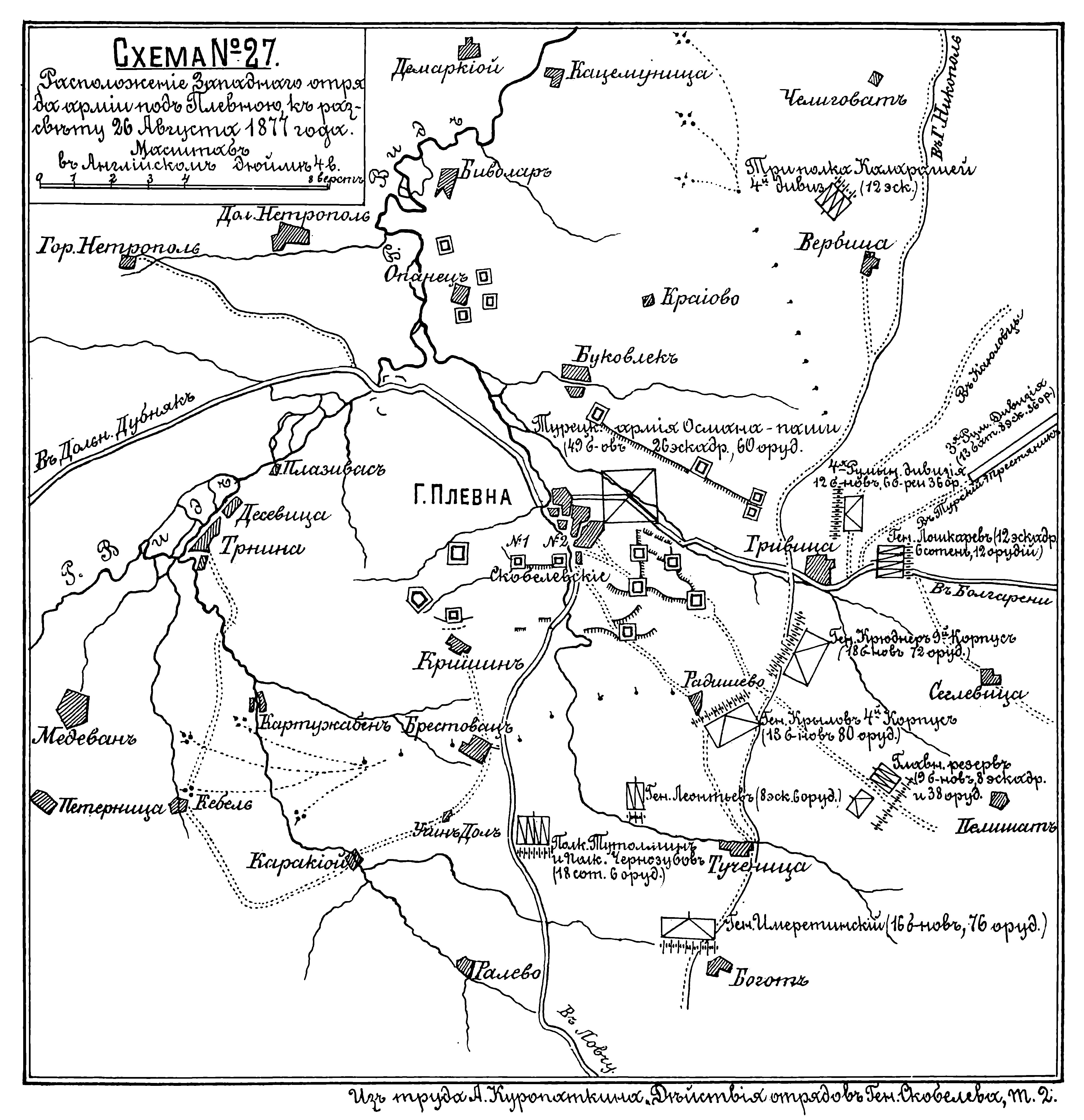 Расположение Западного отряда армии под Плевной к рассвету 26 августа 1877 года