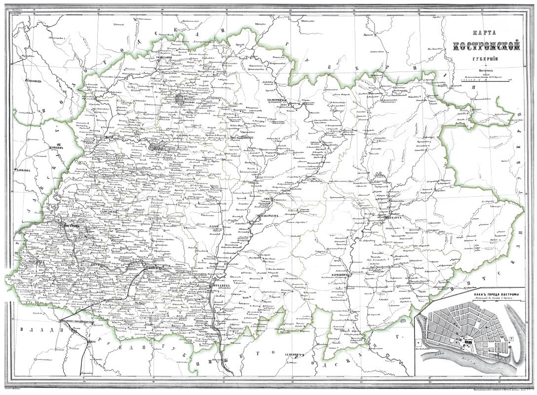 Карта Костромской губернии из издания: «Подробный атлас Российской Империи с планами главных городов. СПб., 1876»