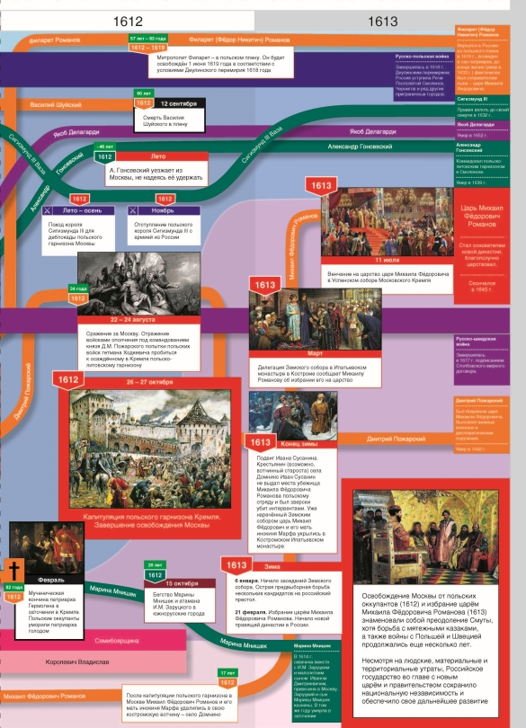 «Наглядная хронология» – новое иллюстрированное издание, представляющее исторические события и процессы на «ленте времени». Впервые читатель получает возможность ознакомиться с серией наглядных пособий по истории России. Настоящий выпуск посвящён Смутному времени – сложному периоду российской истории конца XVI – начала XVII вв., от пресечения династии Рюриковичей до воцарения династии Романовых. Исторические события с датами и пояснениями представлены здесь в хронологической последовательности. Они накладываются на «линии жизни» основных деятелей Смутного времени, представляющих три государства: Россию, Речь Посполитую и Швецию. Издание будет интересно школьникам и учителям в учебном процессе и при подготовке к ЕГЭ, студентам и преподавателям, а также всем любителям истории.