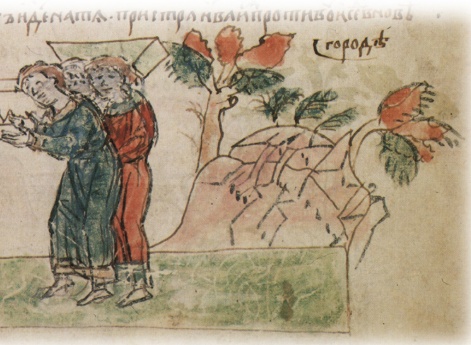 Посольство Владимира Святославича Новгородского к Рогволоду Полоцкому с целью сватовства к его дочери Рогнеде; беседа Рогволода с Рогнедой, отказавшейся стать женой Владимира, но пожелавшей иметь мужем Ярополка Святославича Киевского.