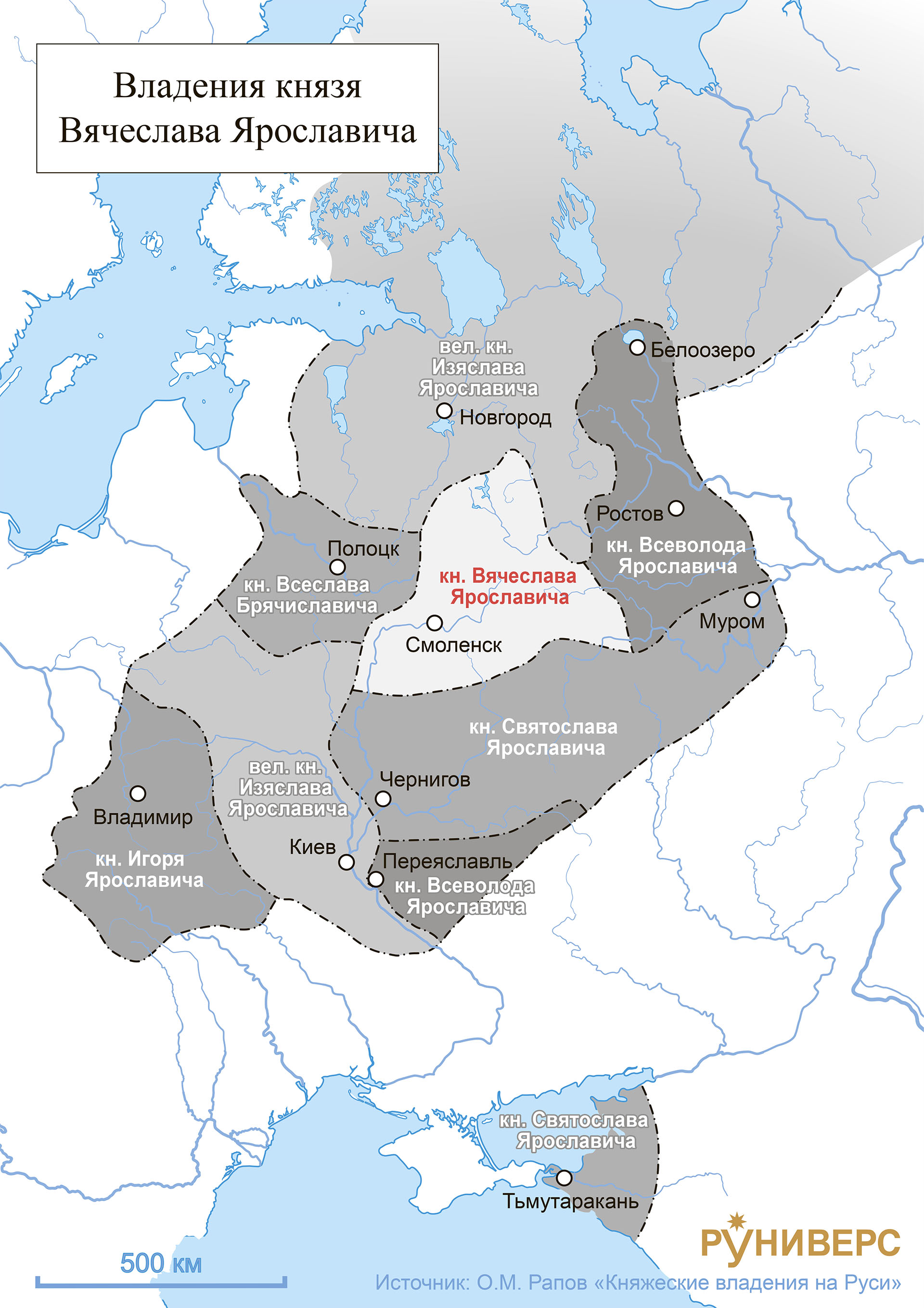Согласно завещанию Ярослава Влаидимровича в 1054 г владением одного из его младших сыновей -- Вячеслава Ярославича (1036—1057) стала Смоленская волость. Она занимала обширные пространства вокруг верхнего течения р. Днепр, простираясь от Смоленска на север до верховьев Днепра и Волги, на востоке – до р. Угра, и верховье р. Москва, на юге – до Десны и нижнего течения р. Сож, на северо-западе – до р. Ловать. После смерти Вячеслава Ярославича смоленским князем, по решению трех старших Ярославичей (Изяслава, Святослава и Всеволода) стал Игорь Ярославич, переведенный на смоленский престол с Волыни. После его смерти в 1060 г. Смоленская волость возвращается под контроль киевского великого князя, и дань с нее делится поровну между тремя старшими Ярославичами.
