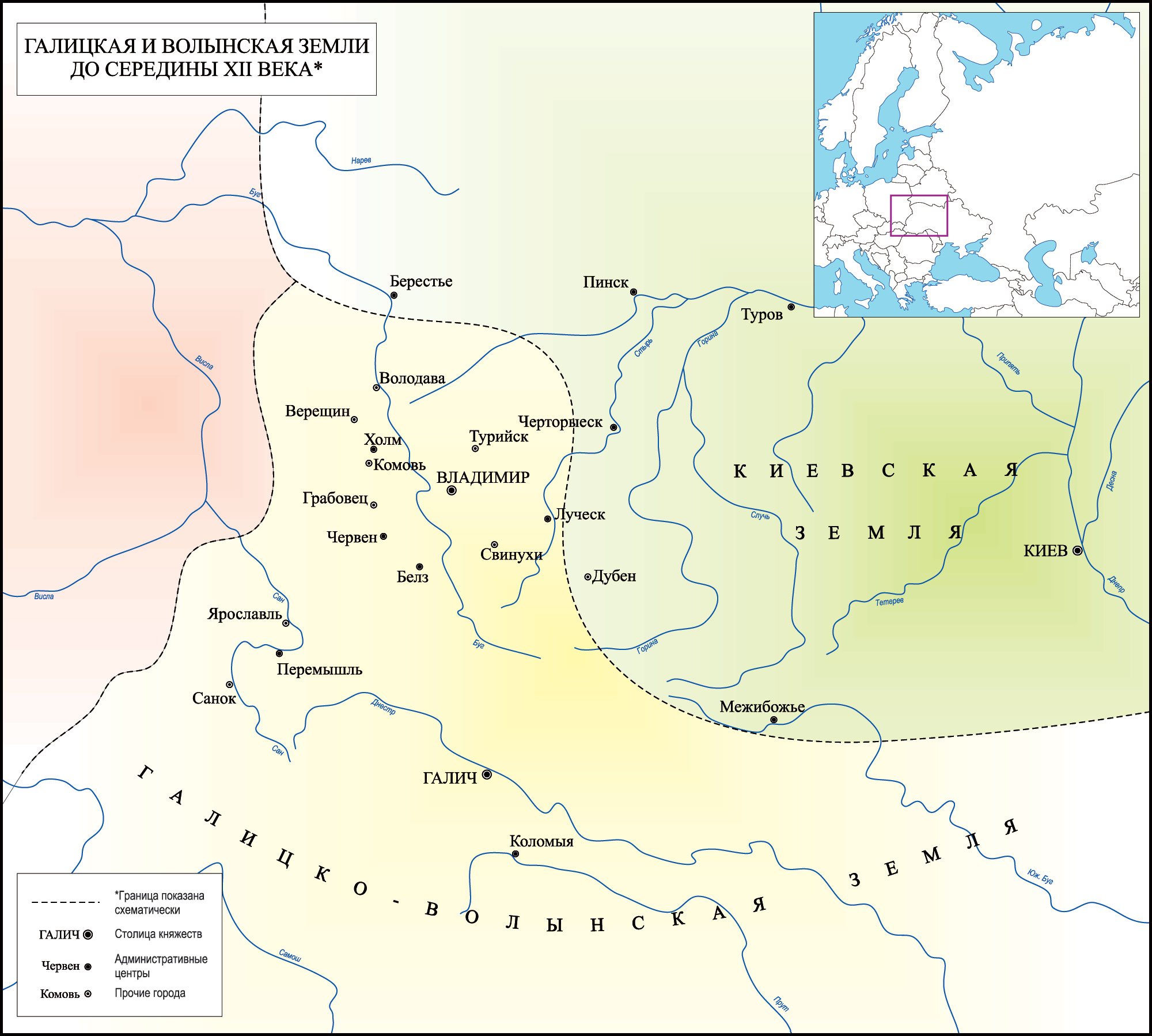 В процессе разделения средневековой Руси на фактически самостоятельные земли в XII в. Галицкая земля сложилась из Перемышльской и Теребовльской волостей и стала независимой от Киева под властью потомков старшего внука Ярослава Мудрого Ростислава Владимировича (Ростиславичами). В 1199 г. местная княжеская ветвь Ростиславичей прекратилась, и Галицкая земля стала объектом длительной борьбы русских князей из разных земель (Волынской, Черниговской, Смоленской), а также венгров и поляков. Победителем в этой борьбе стал волынский князь Даниил Романович (представитель старшей линии Мономаховичей – потомков Владимира Мономаха).