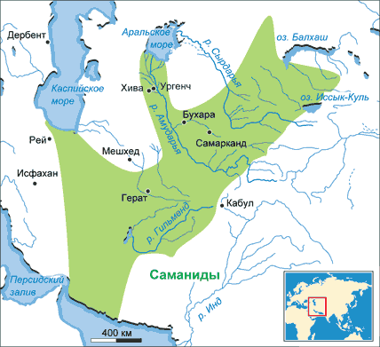 «Саман, знатный перс из Балха, под руководством Асада б. Абдаллаха, наместника Хорасана, отказался от зороастризма, принял ислам и назвал своего сына Асадом, по имени своего покровителя. Четыре сына Асада выдвинулись на службе у халифа Мамуна и около 819 (204) г. получили в награду следующие области: Нух — Самарканд, Ахмед — Фергану, Яхъя — Шаш и Ильяс — Герат. Ахмед играл среди братьев руководящую роль[i] и не только наследовал Нуху в Самарканде, но также присоединил к своим владениям Кашгар[ii]. Его второй сын Исмаил в 903 (290) г. отнял у Саффаридов Хорасан, потом разбил Алида Мухаммеда б. Зейда табаристанского[iii] и подчинил своей власти всю страну от великой пустыни до Персидского залива, от границ Индии до окрестностей Багдада[iv]. Его власть была крепче всего в Трансоксиане, где Бухара и Самарканд сделались центром цивилизации, учености, искусств и учебной деятельности для значительной части мусульманского мира Власть его преемников была ослаблена восстаниями в Хорасане и Седжестане и усилением Бувейхидов. Через полвека господство Саманидов почти не простиралось за пределы Трансоксианы и Хорасана; фактическая власть все более и болеепереходила в руки тюркских рабов, которыми был переполнен двор Саманидов. Один из них, Алп-тегин, основал династию Газневидов, которая в 995[v] (385) г. наследовала Саманидские владения, расположенные к югу от Аму-Дарьи. К северу от реки могущество Саманидов было ослаблено туркестанскими илек-ханами, достигшими главенства над всеми тюркскими племенами от Ферганы до границ Китая[vi]. В 992[vii] (382) г. они сделали нашествие на Трансоксиану и взяли Бухару, а в 999 (389) г. положили конец династии Саманидов, хотя Ибрагим Мунтасир до 1004 (395) г. продолжал борьбу за престол[viii]»