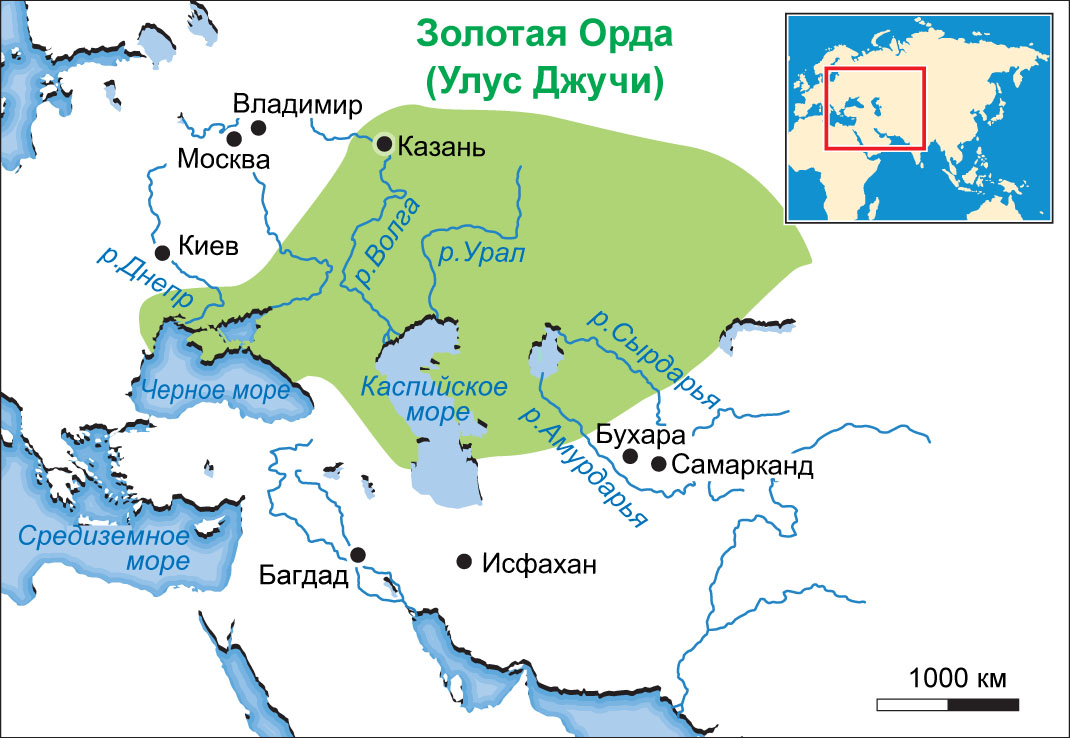 , потомки Джучи (Джочи), территория государства которых простиралась от нижнего Дуная и Финского залива на западе до бассейна Иртыша и нижней Оби на востоке; от Черного, Каспийского и Аральского морей и озера Балхаш на юге до Новгородских земель на севере. В частности, ханы Голубой Орды из «дома Бату», правили на юге России, в Хорезме и западной части Кипчакской степи, а ханы Белой Орды из «дома Орды»,- в Западной Сибири и восточной части Кипчакской степи. Население Золотой Орды было пестрым по этническому и конфессиональному составу. Крупными центрами торговли, преимущественно караванной, являлись Сарай-Бату, Сарай-Берке, Ургенч, крымские города Судак, Кафа (Феодосия) и др. Государство не было централизованным, борьба за власть между царевичами дома Джучи началась уже после смерти хана Монгке-Тимура (1267-1280). При ханах Тоде-Монгке (1280-1287) и Толе-Бука (1287-1291) фактическим правителем государства стал темник Ногай. Восстановление могущества Золотой Орды произошло при хане Мухаммаде Озбеге (Узбек) (1313-1341) и его преемнике Джани-беге (Джанибек) (1342-1357). Военные силы государства насчитывали до 300 тыс. человек. Однако после 1357 г. наметился распад Золотой Орды, ханы сменяли друг друга, не задерживаясь долго на престоле. В 1360-1370-х гг. фактическим правителем государства стал темник Мамай. От Золотой Орды отпал Хорезм, отделилась Астрахань. Попытка Мамая восстановить власть ордынцев на Руси привела к разгрому его войска в Куликовской битве 1380 г. Временное затишье наступило при хане Токтамыше (Тохатмыше) (1377-1395), которому удалось разгромить войско Мамая. Однако противоборство с новой грозной силой в лице Тимура (1336-1405) ускорило распад Золотой Орды. В начале 1420-х гг. образовалось Сибирское ханство, в 1440-е гг. — Ногайская Орда, позже возникли Казанское ханство (1437 г.) и Крымское ханство (1449 г.), а в 1460-е гг. — Казахское, Узбекское ханства, в 1466 г. — Астраханское ханство.