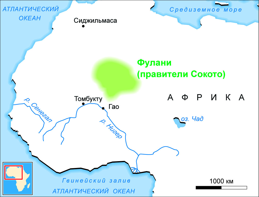1804-1808 (1218-1223) Усман б. Фуди (Usumanu dan Fodio), объявивший в этому году хиджру и джихад (ум. в 1817)