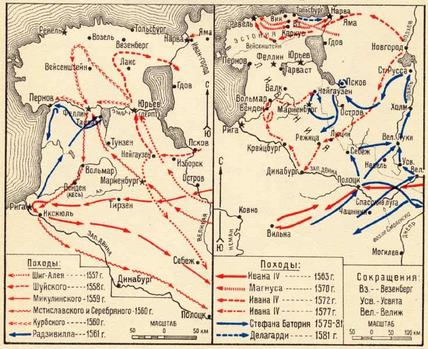 Карта. Ливонская война 1558—1583 «Ливонская война стала "делом всей жизни" Ивана IV… Ливония, созданная в XIII в. немецкими рыцарями-меченосцами, представляла собой в XIV в. слабое государство, по сути разделенное между Орденом, епископами и городами. Орден возглавлял его лишь формально. Вместе с тем Орден, опираясь на поддержку других государств, препятствовал установлению контактов России с западноевропейскими странами. Непосредственным же поводом к началу Ливонской войны послужил вопро...
