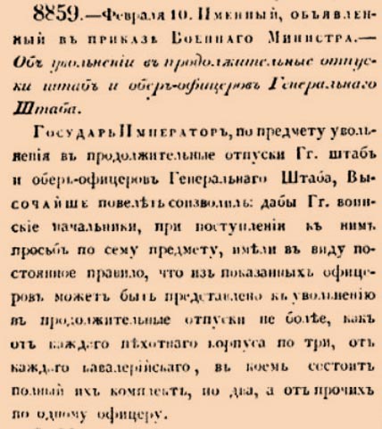 8859. 1836 год. 22 февраля (10 февраля ст.ст.) Именный, объявленный в приказе Военнаго Министра. Об увольнении в продолжительные отпуски штаб и обер-офицеров Генеральнаго Штаба.Государь Император, по предмету увольнения в продолжительныя отпуски Гг. Штаб и обер-офицеров Генеральнаго Штаба, Высочайше повелеть соизволил: дабы Гг. воинские начальники, при поступлении к ним просьб по сему предмету, имели в виду постоянное правило, что из показанных офицеров может быть предоставлено к увольнению в продолжительные отпуски не более, как от каждаго пехотнаго корпуса по три <…>