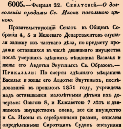 Закон № 6005. 1833 год. 22 февраля (6 марта). Сенатский указ о разрешении опекунам продавать иконы по частному соглашению (по вольной цене) в интересах содержания несовершеннолетних сирот, в разъяснение запрета на публичные торги.