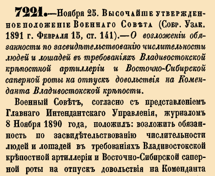 О возложении обязанности по засвидетельствованию численности людей и лошадей в требованиях Владивостокской крепостной артиллерии и Вост