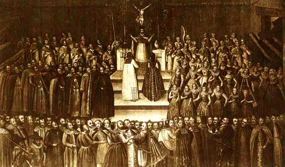 Заочное обручение Марины Мнишек с Лжедмитрием I в Кракове. 12 ноября 1605. Гравюра с картины неизвестного художника. XVII век