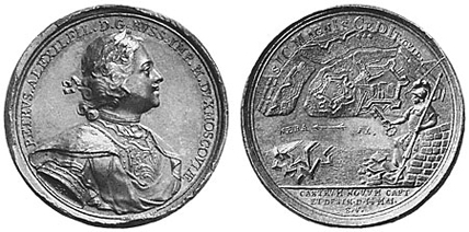 На следующий (1703) год, в апреле, от Шлюссельбурга вниз по правому берегу Невы шли русские войска под начальством фельдмаршала Шереметева; шли они лесами большими и малыми и завидели наконец при устье Охты в Неву маленький земляной городок, занимавший не более десятины земли: то были Канцы, или Ниеншанц, стороживший устье Невы. Против городка, за Охтою, посад из 400 деревянных домиков. К русскому войску приехал бомбардирский капитан Петр Михайлов и съездил на 60 лодках осмотреть Невское устье. Вечером 30 апреля началось бомбардирование, утром 1 мая Канцы сдались и переименованы в Шлотбург. Но на другой же день вечером караульные донесли, что на взморье показались неприятельские корабли. 5 мая два шведских судна, шнява и большой бот, подошли к устью Невы; бомбардирский капитан Петр Михайлов и поручик Меншиков с обоими гвардейскими полками на тридцати лодках подкрались к неприятельским судам, окружили и взяли их, несмотря на то что у шведов были пушки, а у русских их не было. Людей на обоих судах было около 80; "но, - писал Петр Апраксину, - понеже неприятели пардон зело поздно закричали, того для солдат унять трудно было, которые, ворвався, едва не всех покололи, только осталось 13 живых. Смею и то писать, что истинно с 8 лодок только в самом деле было. И сею, никогда бываемою викториею вашу милость поздравляю".