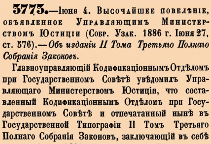 3773. 1886 год. 16 июня (4 июня ст.ст.) Высочайшее повеление, объявленное Управляющим Министерством Юстиции. Об издании II Тома Третьяго Полнаго Собрания Законов. Главноуправляющий Кодификационным Отделом при Государственном Совете уведомил Управляющаго Министерством Юстиции, что составленный Кодификационным Отделом при Государственном Совете и отпечатанный ныне в Государственной Типографии II Том Третьяго Полнаго Собрания Законов, заключающий в себе узаконения за 1882 год, всеподданнейше повергнут им 4 Июня 1886 года на Всемилостивейшее воззрение Его Императорскаго Величества