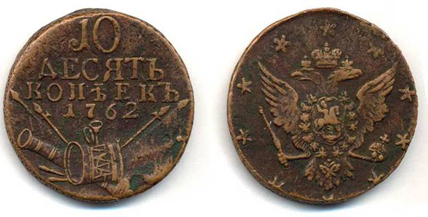 10-копечная монета Петра III из перечеканенной «арматурной» серии