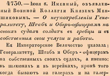 4730. 1725 год. 8 июня (19 июня). Именный, объявленный Военной Коллегии Князем Меншиковым. О неупотреблении Генералитету, Штаб и Обер-офицерам на своих судах солдат в гребцы и в собственныя свои услуги и работы