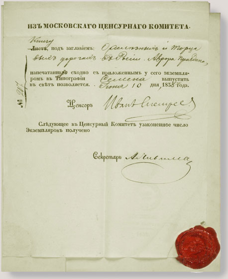 Разрешение Московского цензурного комитета от 10 июня 1838 г. на выпуск книги А. Правдина "О железных и торцовых дорогах в России".1826 год. 22 июня (10 июня ст.ст.) был издан цензурный устав, прозванный современниками за громоздкость и излишнюю подробность «чугунным». «В борьбе с крамолой, с чего и началось правление Николая I, естественно император опирался на полицию и цензуру. В отношении последней ему не пришлось изобретать что-то новое: на первых порах его вполне устроила та политика, которую проводил министр духовных дел и народного просвещения в 1824–1828 гг. Из «Высочайше утвержденного Устава о Ценсуре»
