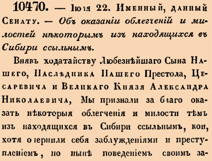 10470. 1837 год. 4 июля (22 июня ст.ст.) Именный, данный Сенату. Об оказании облегчений и милостей некоторым из находящихся в Сибири ссыльным.Вняв ходатайству Любезнейшаго Сына Нашего, Наследника Нашего Престола, Цесаревича и Великаго Князя Александра Николаевича, мы признали за благо оказать некоторыя облегчения и милости тем из находящихся в Сибири ссыльным, кои, хотя очернили себя заблуждениями и преступлением, но ныне поведением своим заслуживают, чтоб на них было обращено действие Нашего милосердия <…>