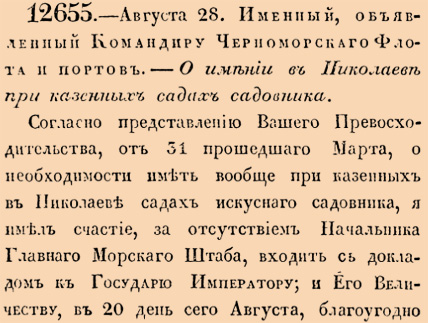 12655. 1839 год. 9 сентября (28 августа ст.ст.) Именный, объявленный Командиру Черноморскаго Флота и портов. О имении в Николаеве при казенных садах садовника. Согласно представлению Вашего Превосходительства, от 31 прошедшаго Марта, о необходимости в Николаеве садах искуснаго садовника, я имел счастье, за отсутствием Начальника Главнаго Морскаго Штаба, входит с докладом к Государю Императору; и Его Величеству, в 20 день сего Августа, благоугодно было Высочайше повелеть, чтобы впредь, для присмотра и улучшения казенных садов в Николаеве, нанимаем был по контракту искусный садовник, в платою ему до трех тысяч рублей в год <…>
