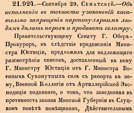 21924. 1805 год. 11 октября (29 сентября ст.ст.) Сенатский. Об исполнении в точности узаконений касательно запрещения партикулярным людям делать порох и продавать селитру. 1) Заведенные, кроме пороховых уговорщиков для дела пороха и вольной продажи, заводы купецких и других чинов людей отписать, и материялы и инструменты все, за презрение указов, взять в казну, и впредь купецким людям и никому порохом не торговать и по ярманкам не возить <…>