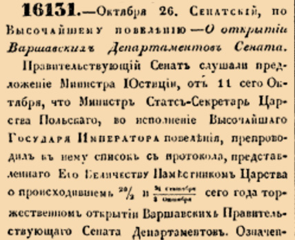Сенатский указ от 26 октября 1842 года предписывает повсеместно объявить о состоявшемся в сентябре того же года торжественном открытии Варшавских Департаментов Правительствующего Сената. Документ оформляет это решение на основании доклада Министра Юстиции, который получил соответствующий протокол от Наместника Царства Польского через Министра Статс-Секретаря.