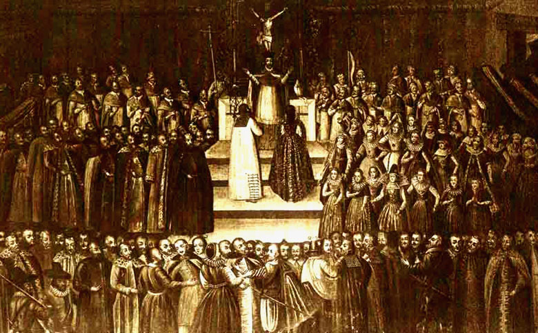 Заочное обручение Марины Мнишек с Лжедмитрием I в Кракове 12 ноября 1605 г. Гравюра с картины неизвестного художника XVII в.