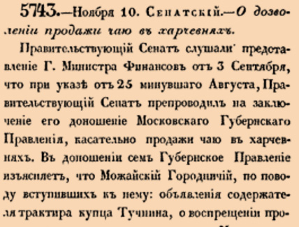 5743. 1832 год. 22 ноября (10 ноября ст.ст.) Сенатский. О дозволении продажи чаю в харчевнях.<…> Приказали: согласно с мнением Г.Министра Финансов, заключение Московскаго Губернскаго Правления, о дозволении продажи чаю в харчевнях, особенно состоящих при постоялых дворах, как сообразное с Высочайше утвержденным 10 Октября 1822 года положением Комитета Гг.Министров, утвердить.