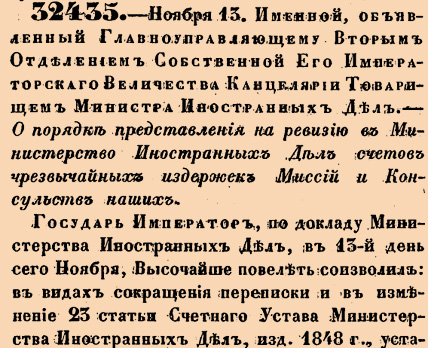 32435. 1857 год. 25 ноября (13 ноября ст.ст.) Именной<...>. О порядке представления на ревизию в Министерство Иностранных Дел счетов чрезвычайных издержек Миссий и Консульств наших.Государь Император, по докладу Министерства Иностранных Дел, в 13-й день сего Ноября, Высочайше повелеть соизволил: в видах сокращения переписки и в изменение 23 статьи Счетнаго Устава Министерства Иностранных Дел, изд. 1848 г., установить общий порядок для доставления сему Министерству счетов чрезвычайных издержек<...>