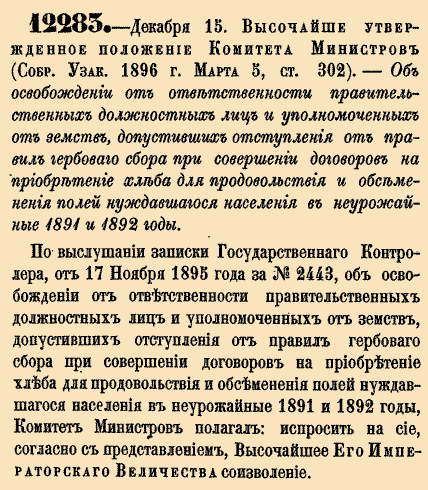 12283. — 27 декабря (15 декабря по ст.ст.). Высочайше утвержденное положение Комитета Министров, 1895 год.Об освобождении от ответственности правительственных лиц и уполномоченных от земств, допустивших отступления от правил гербового сбора при совершении договоров на приобретение хлеба для продовольствия и обсеменения полей нуждающегося населения в неурожайные 1891 и 1892 годы.По выслушивании записки Государственного Контролера, от 17 Ноября 1895 года за № 2443, об освобождении от ответственности правительственных должностных лиц и уполномоченных от земств, допустивших отступления от правил гербового сбора при совершении договоров на приобретение хлеба для продовольствия и обсеменении полей нуждавшегося населения в неурожайные 1891 и 1892 годы, Комитет Министров полагал: испросить на сие, согласно с представлением, Высочайшее Его императорского Величества соизволение.Государь Император, в 15-й день Декабря 1895 года, на сие Высочайше соизволил.