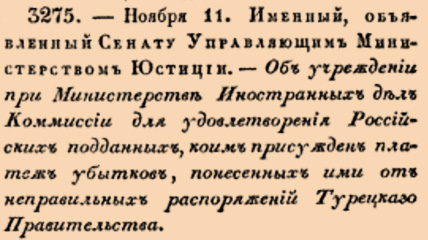 3275. 1829 год. 23 ноября (11 ноября ст.ст.) Именный, объявленный Сенату Управляющим Министерством Юстиции.Об учреждении при Министерстве Иностранных дел Коммиссии для удовлетворения Российских подданных, коим присужден платеж убытков, понесенных ими от неправильных распоряжений Турецкаго правительства.