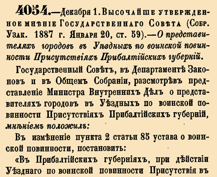 4054. — 13 декабря (1 декабря по ст.ст.). Высочайше утвержденное мнение Государственного Совета, 1886 год.О представителях городов в Уездных по воинской повинности присутствиях Прибалтийских губерний.Государственный Совет, в департаменте Законов и в Общем собрании, рассмотрев представление Министра Внутренних Дел о представителях городов в Уездных по воинской повинности Присутствиях Прибалтийских губерний, мнением положил:В изменение пункта 2 статьи 85 устава о воинской повинности, постановить: "В Прибалтийских губерниях, при действии Уездного по воинской повинности Присутствия в призывном участке, имеющем в своем составе городское поселение, Присутствие сие дополняется Членом от Городской Управы, по ее назначению, а где Городской Управы не имеется — Членом по выбору Городской Думы"