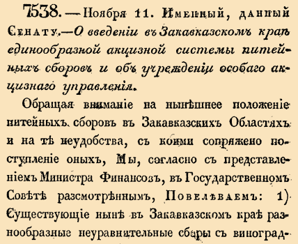 7538. 1834 год. 11 ноября (23 ноября). Именный, данный Сенату, 1834 г. О введении в Закавказском крае единообразной акцизной системы питейных сборов и об учреждении особого акцизного управления