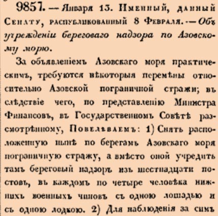 9857. 1837 год. 25 января (13 января ст.ст.) Именный, данный Сенату, распубликованный 8 Февраля. Об учреждении береговаго надзора по Азовскому морю.<…> 1) Снять расположенную ныне по берегам Азовскаго моря пограничную стражу, а вместо оной учредить там береговой надзор из шестнадцати постов, в каждом по четыре человека нижних военных чинов с одной лошадью и одной лодкою <…>