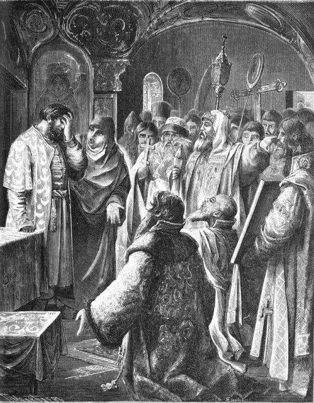 Патриарх Иов и Московский народ просят Бориса Годунова на царство.