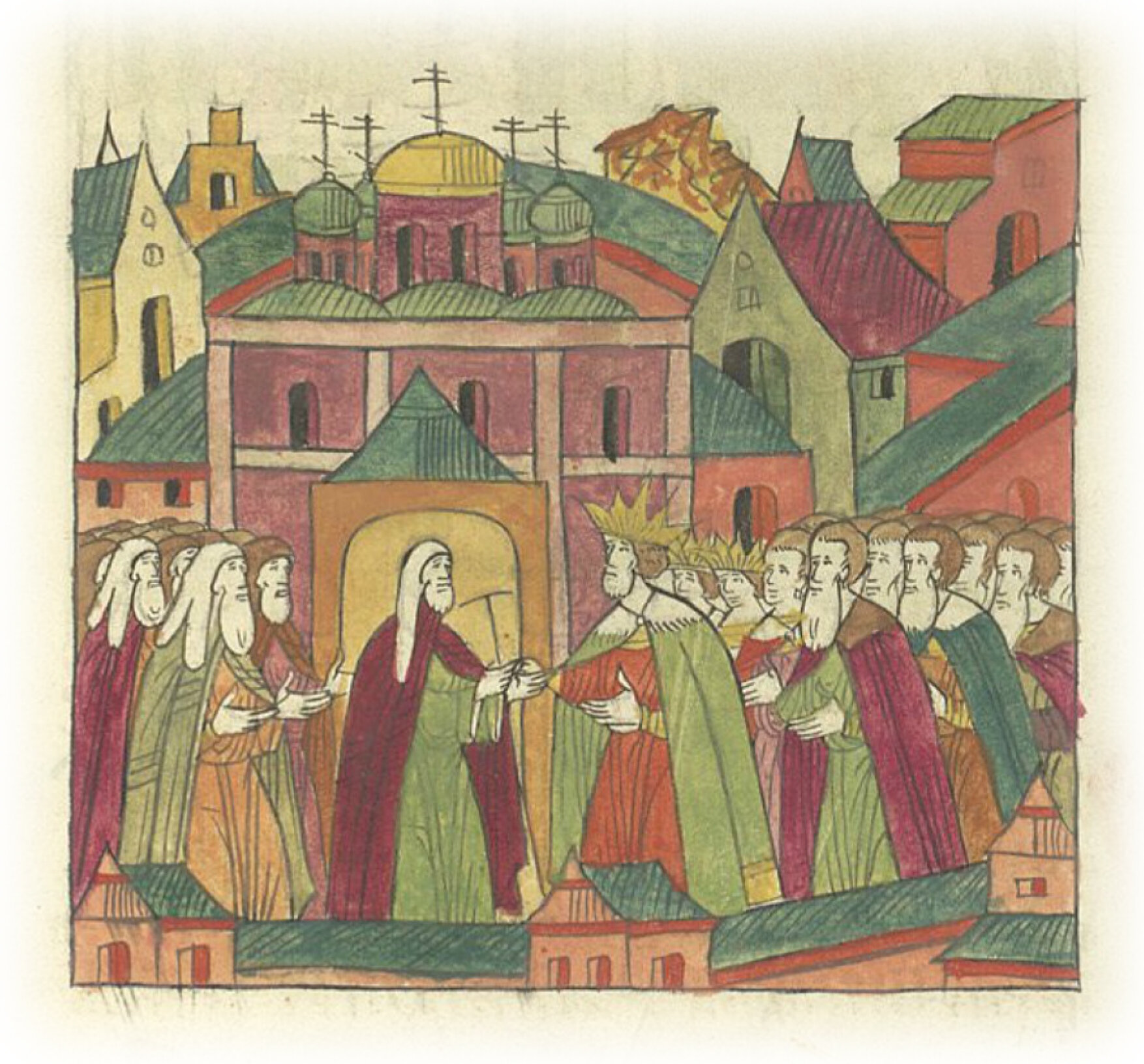 И, сказав речь, дал святителю посох в правую руку, а царевичи и архиепископы, и епископы, и все бояре пели многолетие митрополиту.