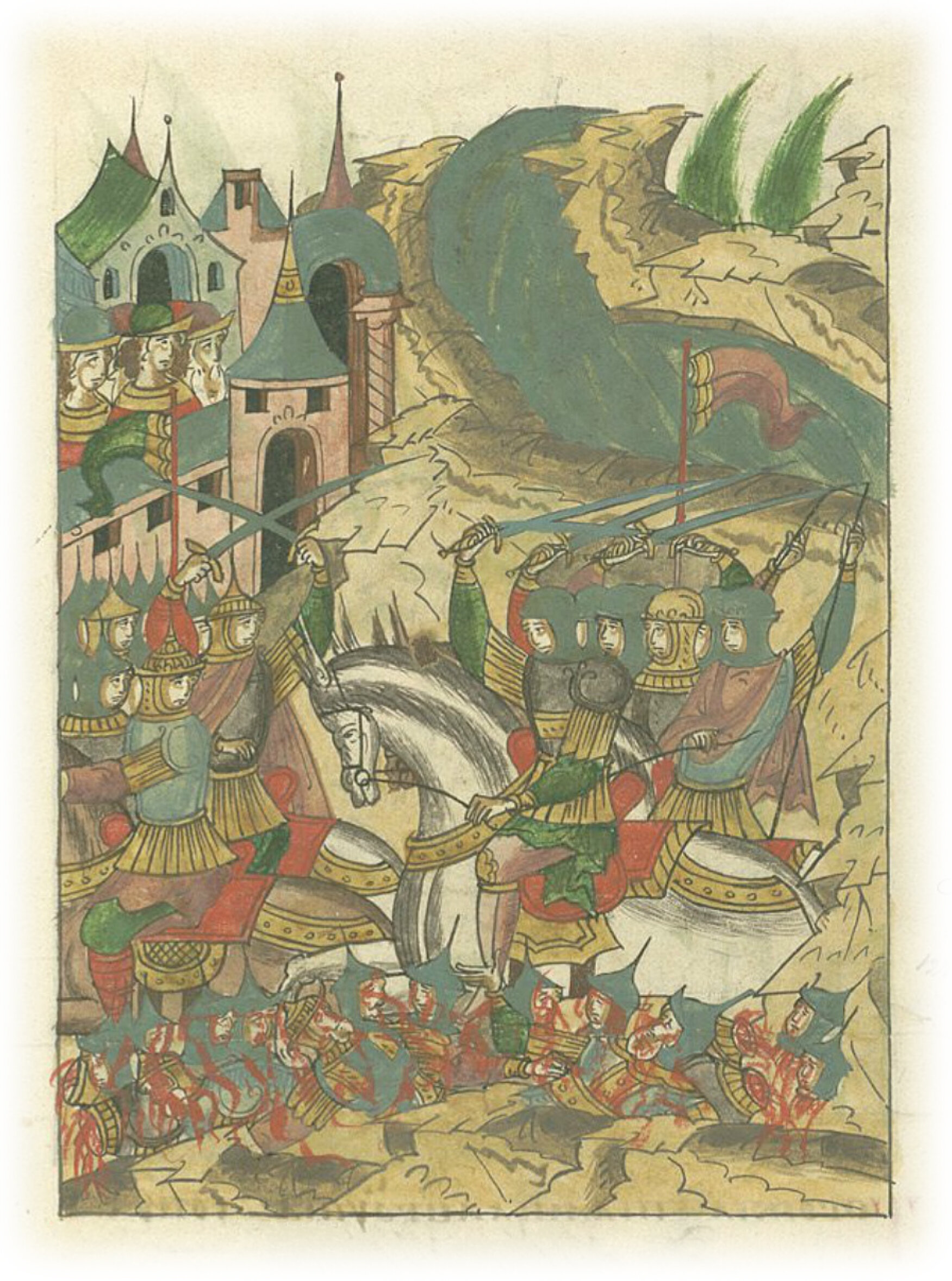 И встретились с немцами, и тогда немцы одолели псковичей, убили 809 человек и троих посадников: Ефрема Корточа, Елентия Губку и Панкратия.